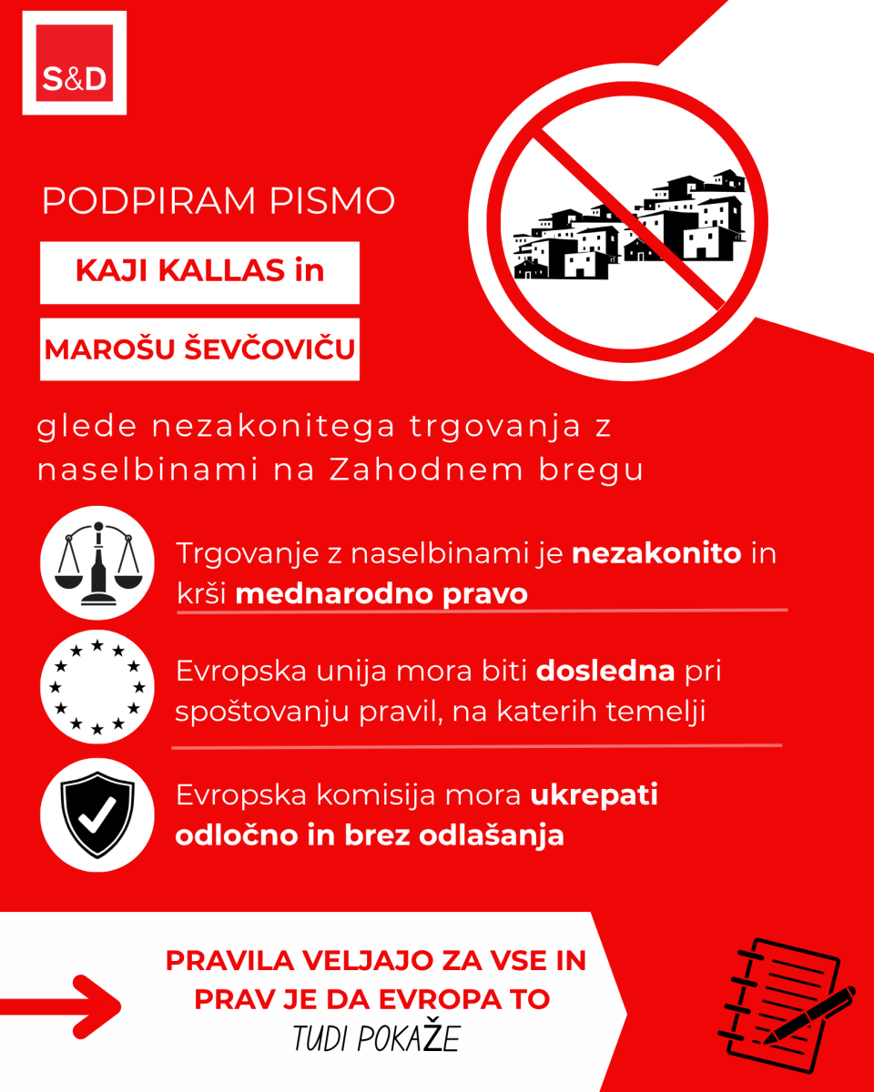 »Evropska unija je v preteklosti že sprejela odločne ukrepe, ko je šlo za skladnost trgovinske politike z vrednotami in pravnimi zavezami – od sankcij proti državam, na primer Rusiji in Iranu, do prepovedi določenih izdelkov, povezanih s kršitvami človekovih pravic ali prisilnim delom. Enaka načelnost mora veljati tudi za Izrael.«